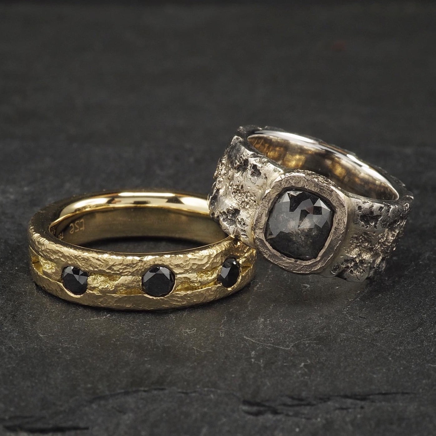 Mixed Crater and hammered wedding ring set with 3 black diamonds in 18k yellow gold. Crater engagement wedding ring soldered together with a salt and pepper diamond in natural 18k white gold and antiqued sterling silver sides
