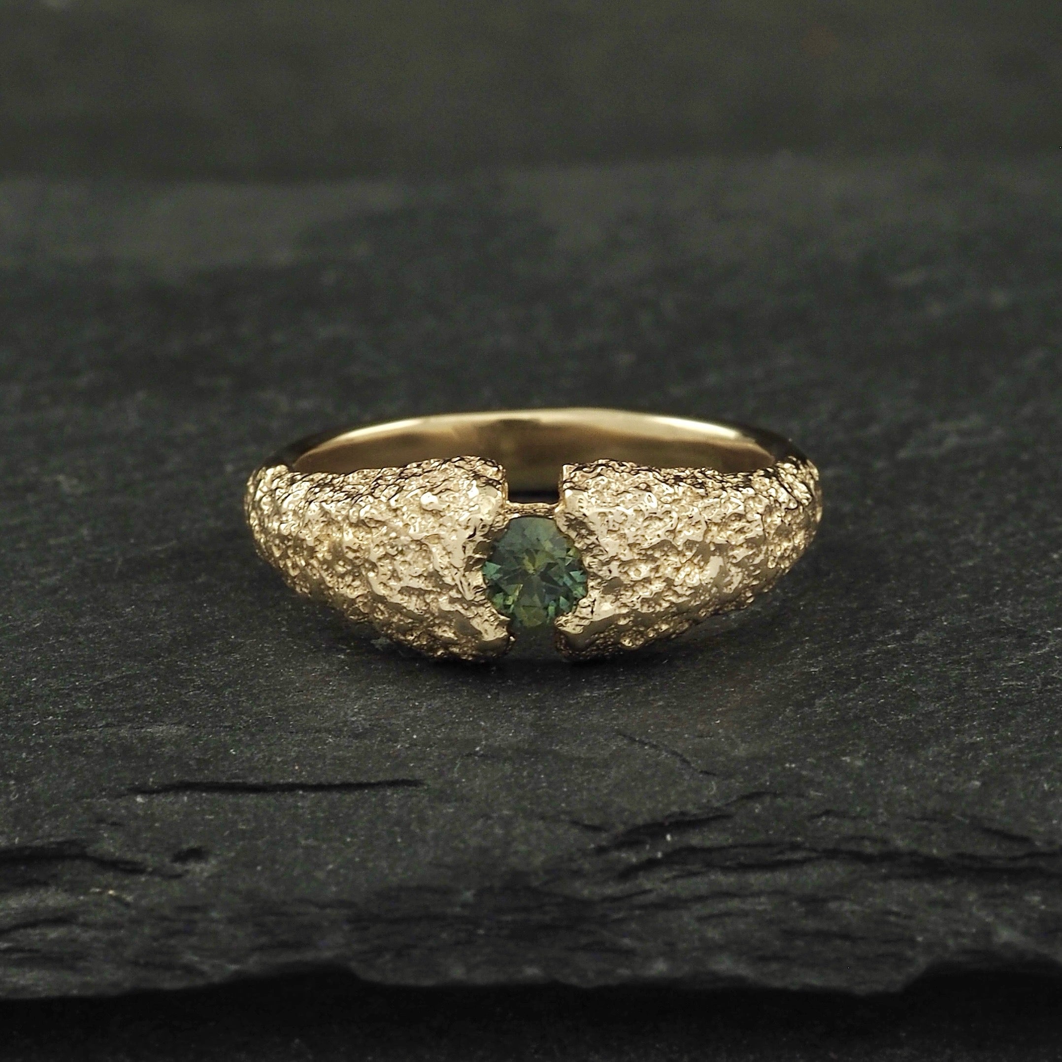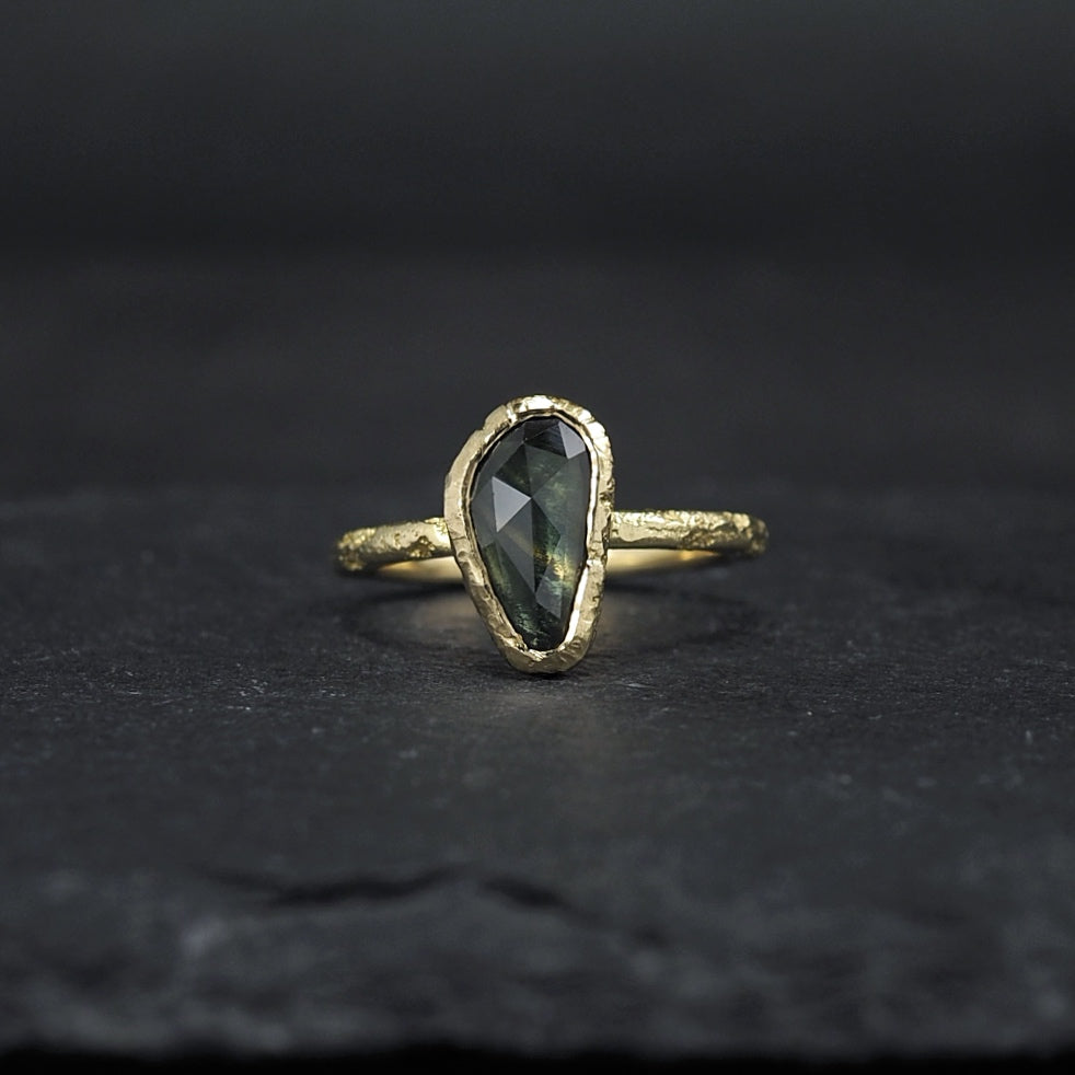 Rare rosecut green yellow sapphire bezel set in 18k yellow gold on a textured Crater band
