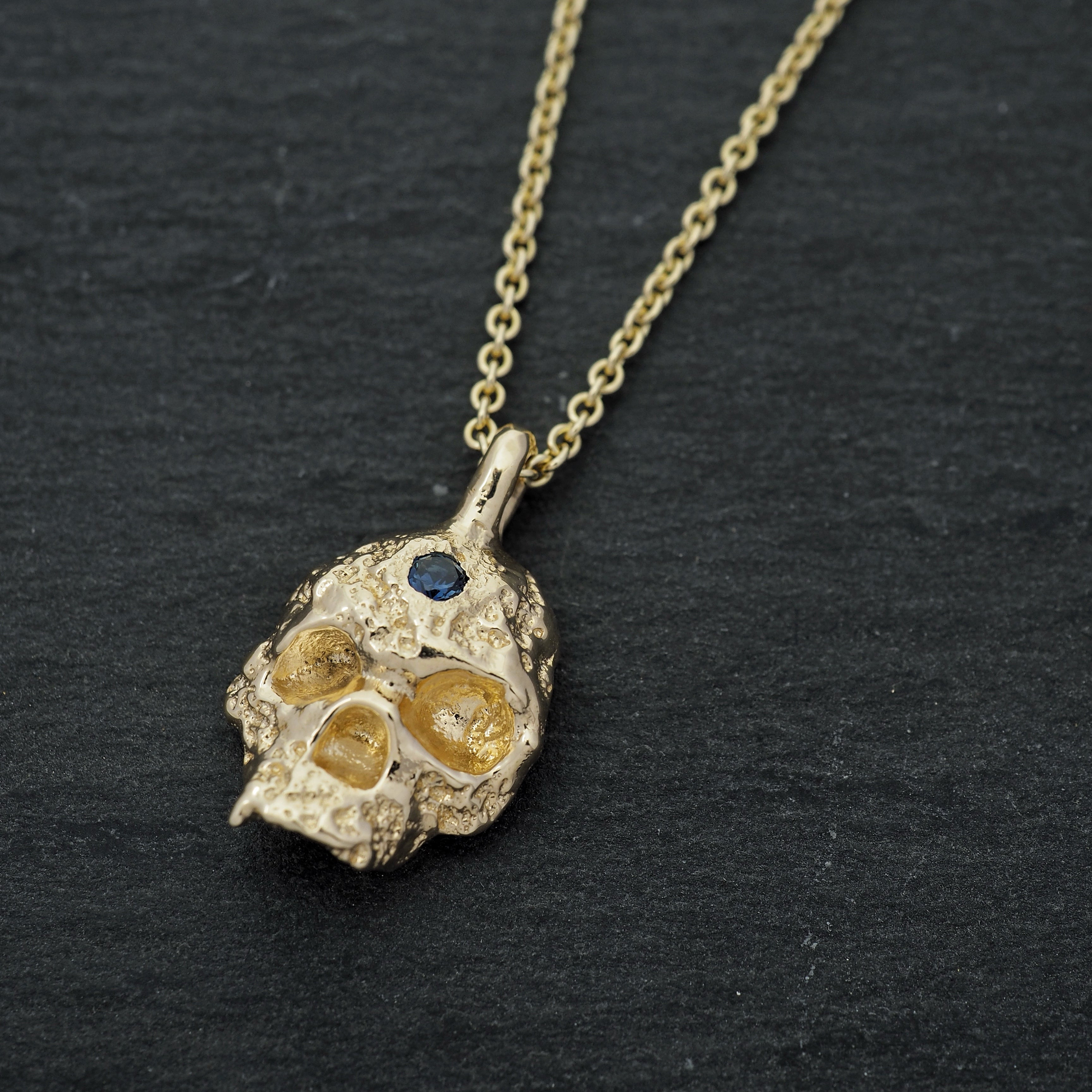 Crater skull in 9k yellow gold set with an Australian blue sapphire