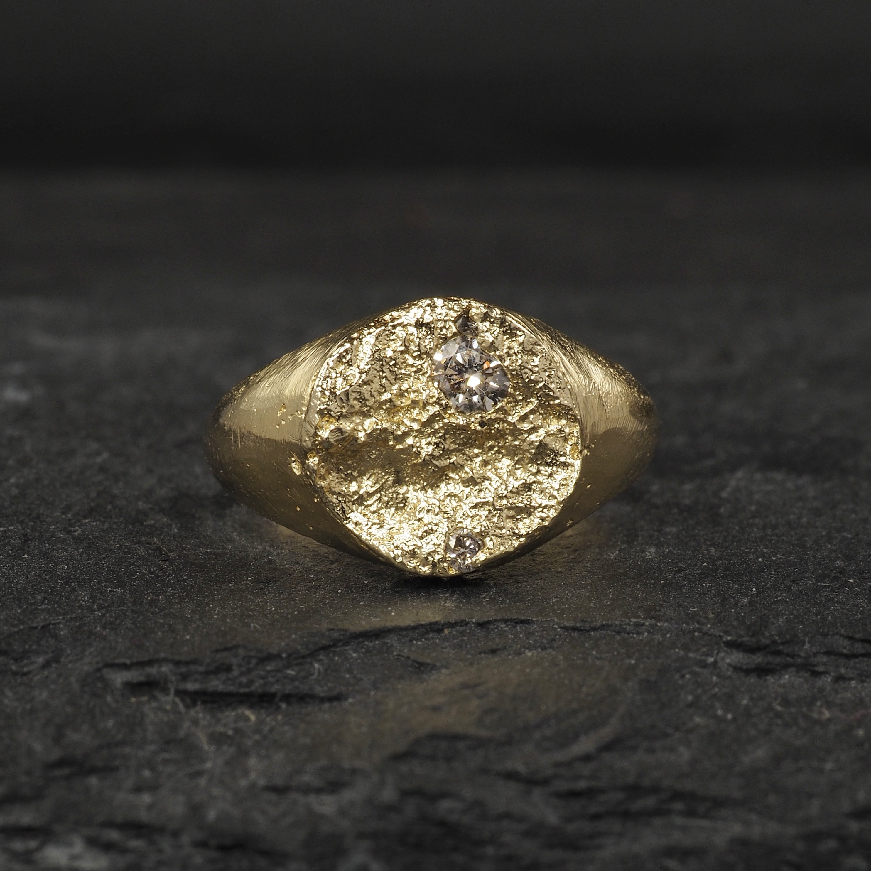 Custom small Terra round signet with a scattering of diamonds with one on the side 1 x 3mm and 2 x 1.7mm in 18k yellow gold