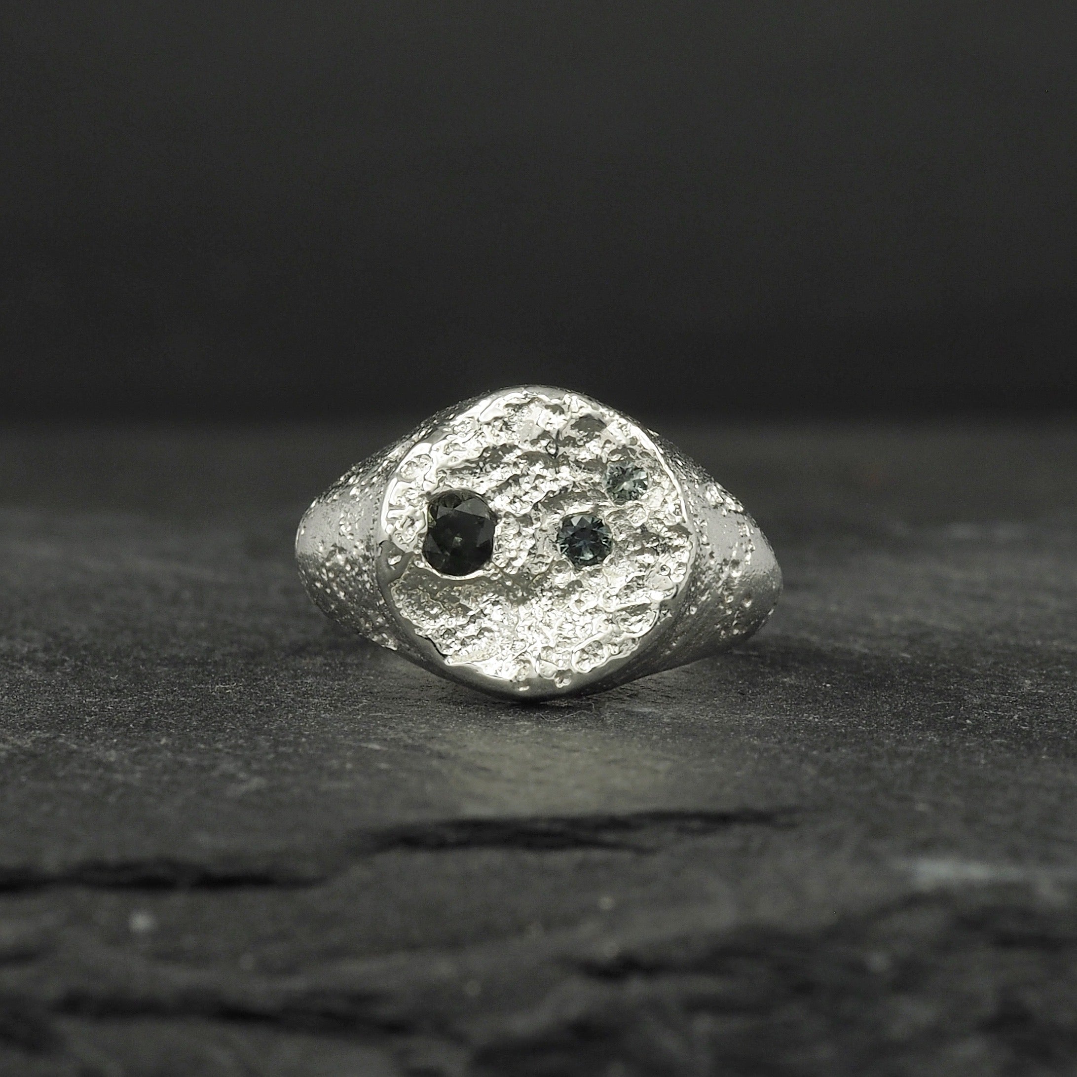 Custom small Terra signet in sterling silver with three blue - green sapphires chosen by the customer, cast in place and set at 2 / 3 / 9 o’clock