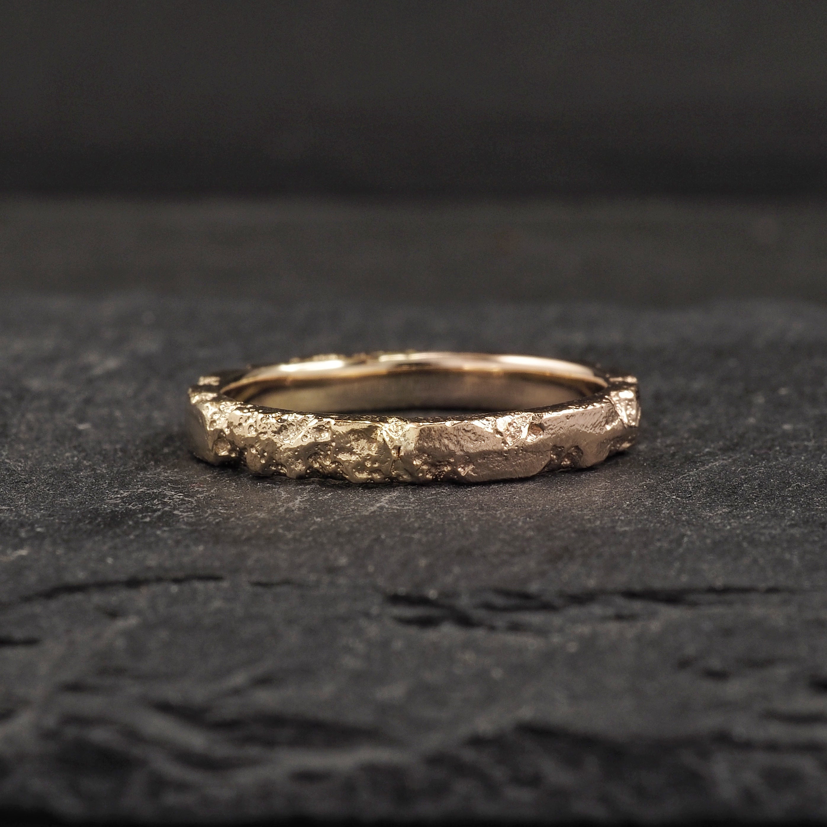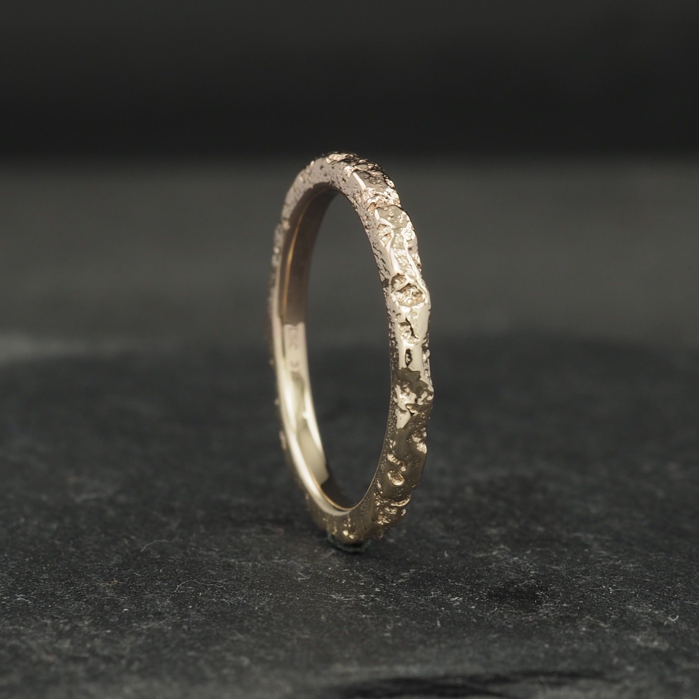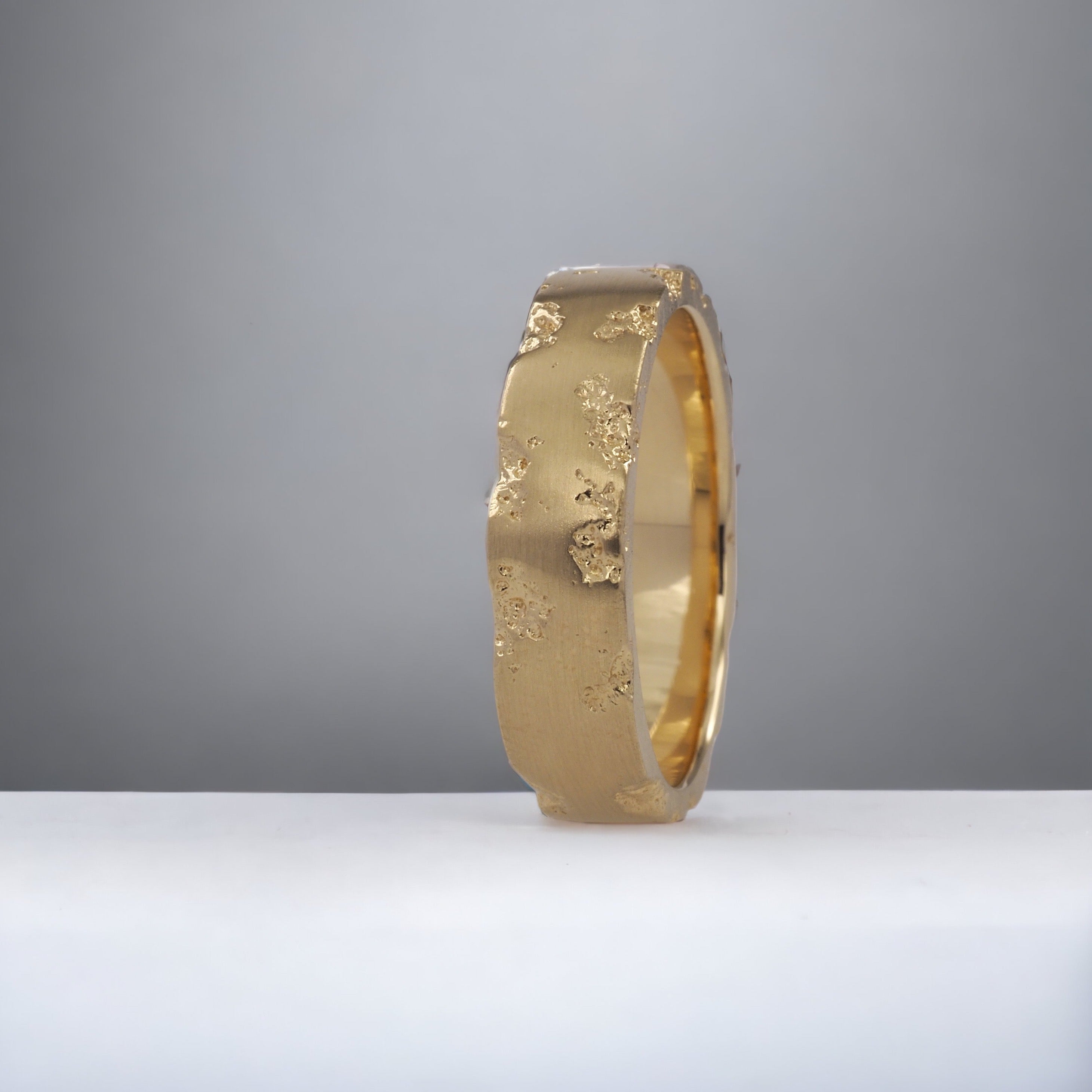 Eon 5 wedding ring textured mainly on the edges and in a matte finish in 9k yellow gold