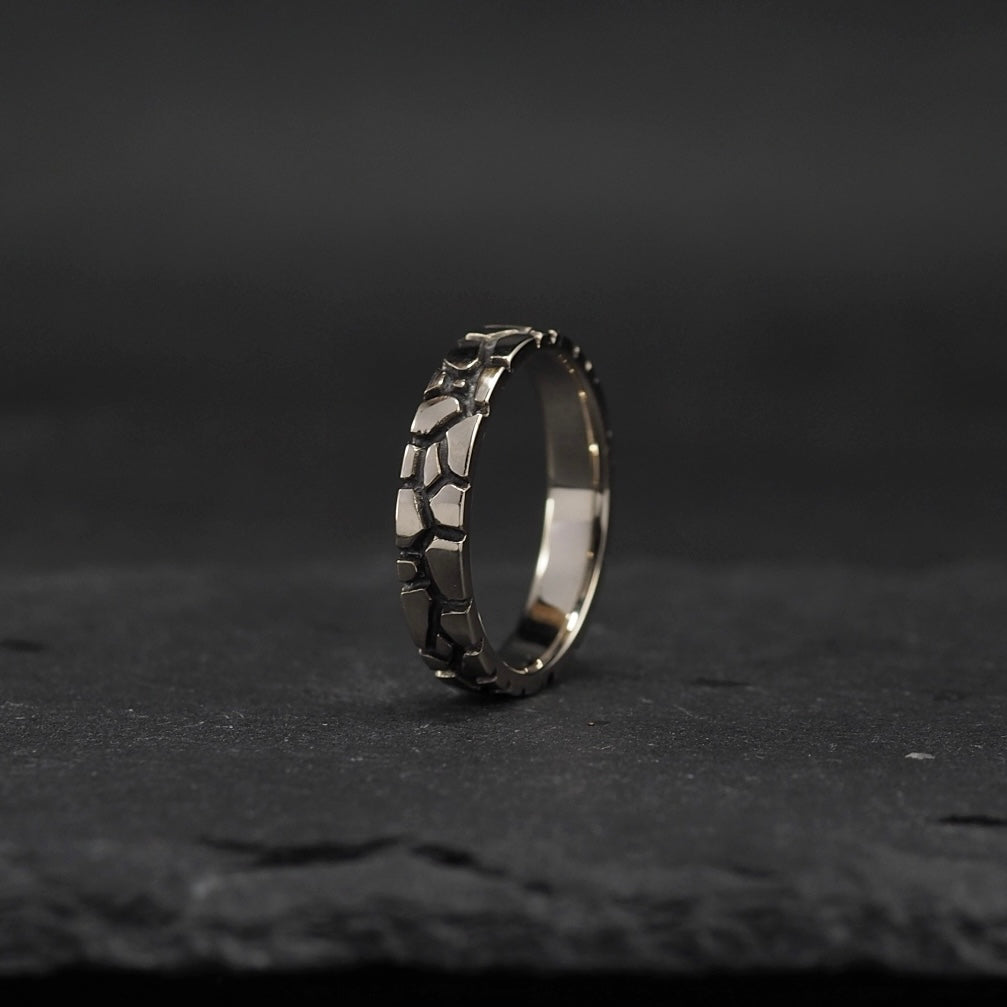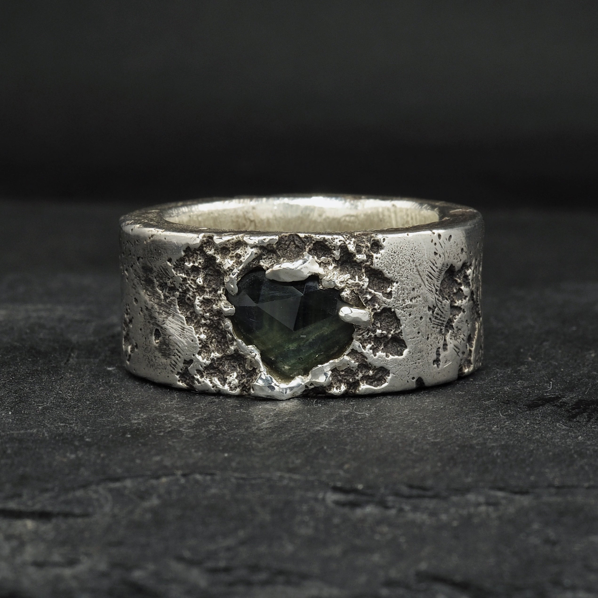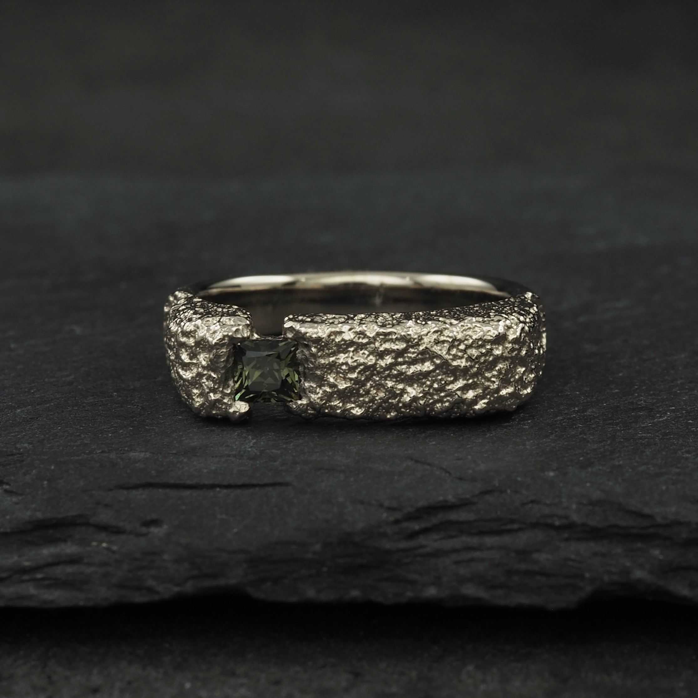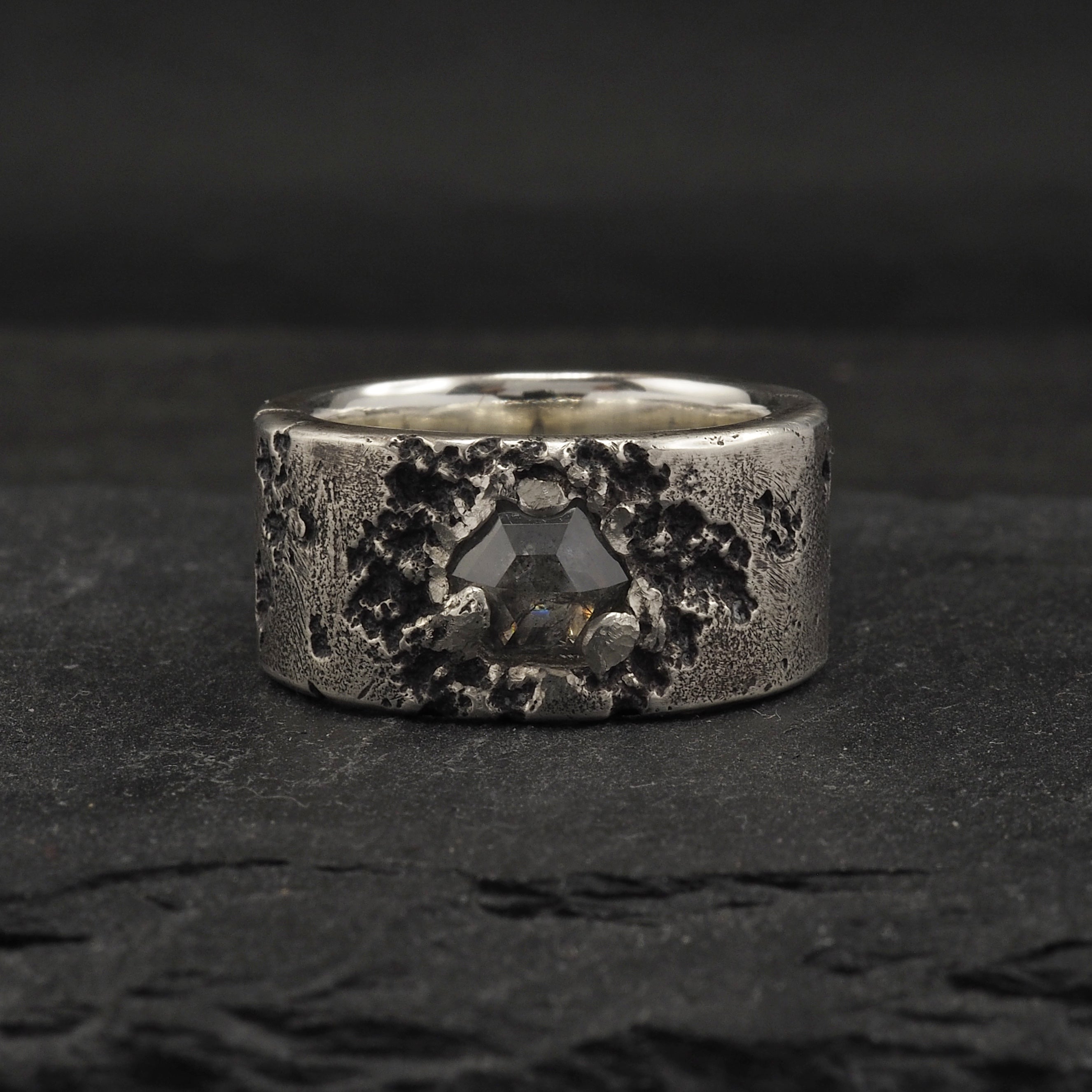 Amélie ring, our Crater texture in platinum set with a triangular salt and pepper diamond and a silver version