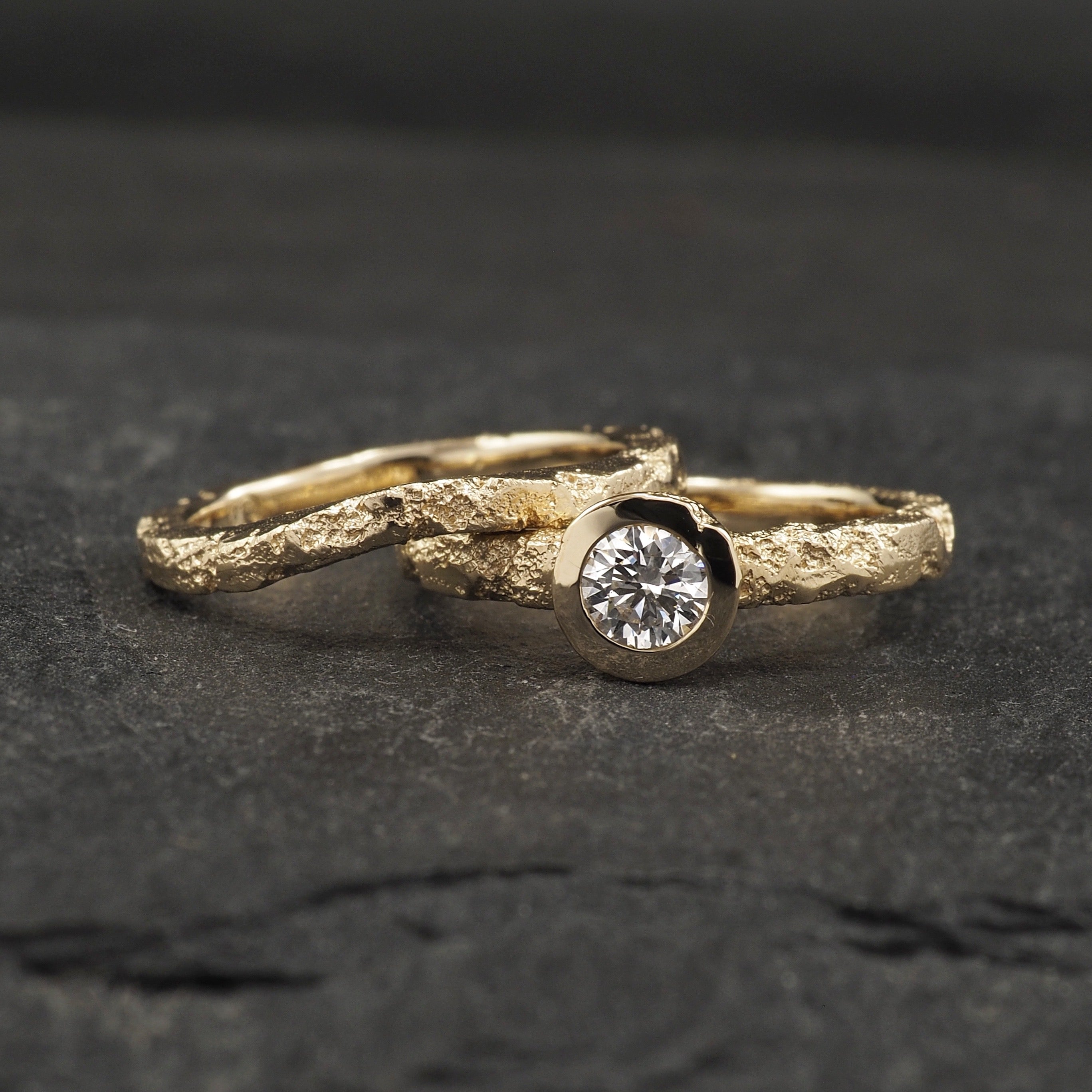 Crater engagement ring with white diamond and matching wedder