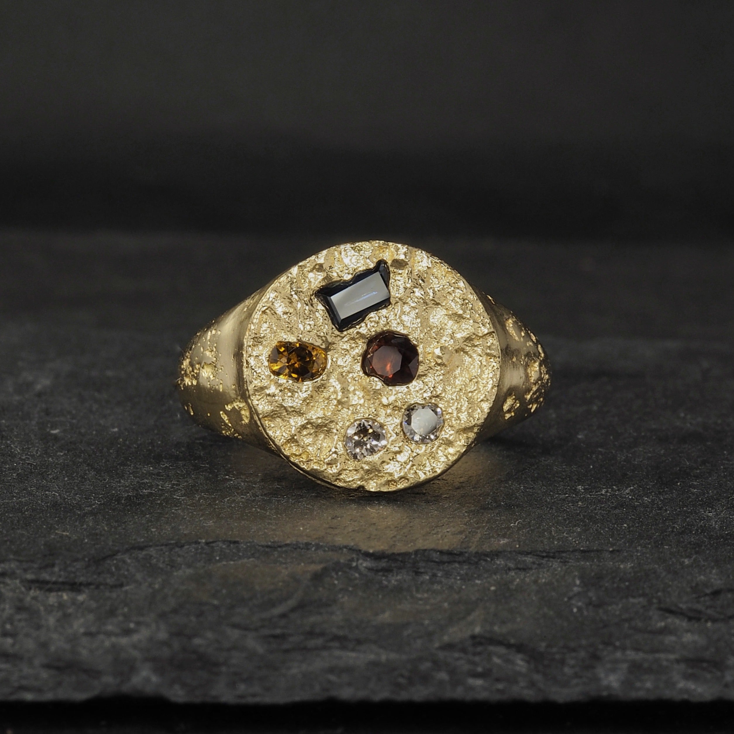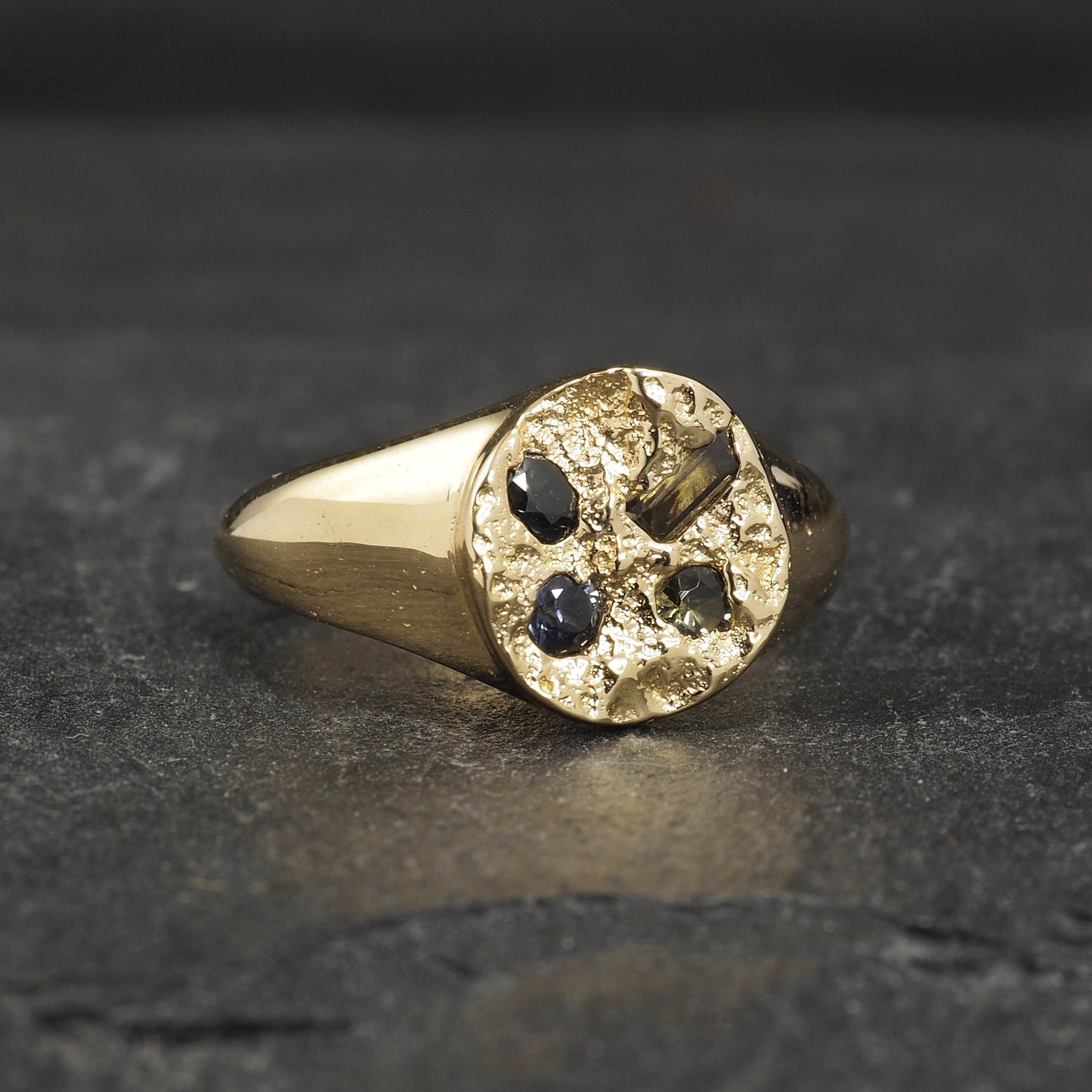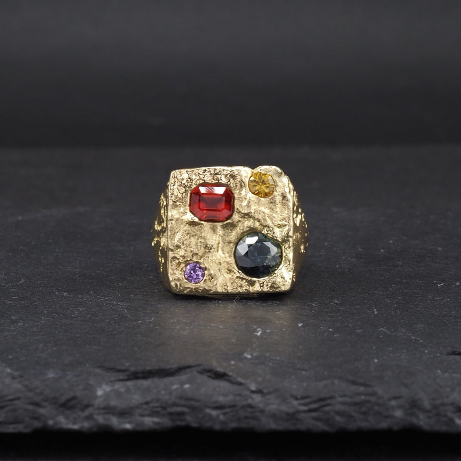 Square Terra signet with a mix of cast in place sapphires in 18k yellow gold