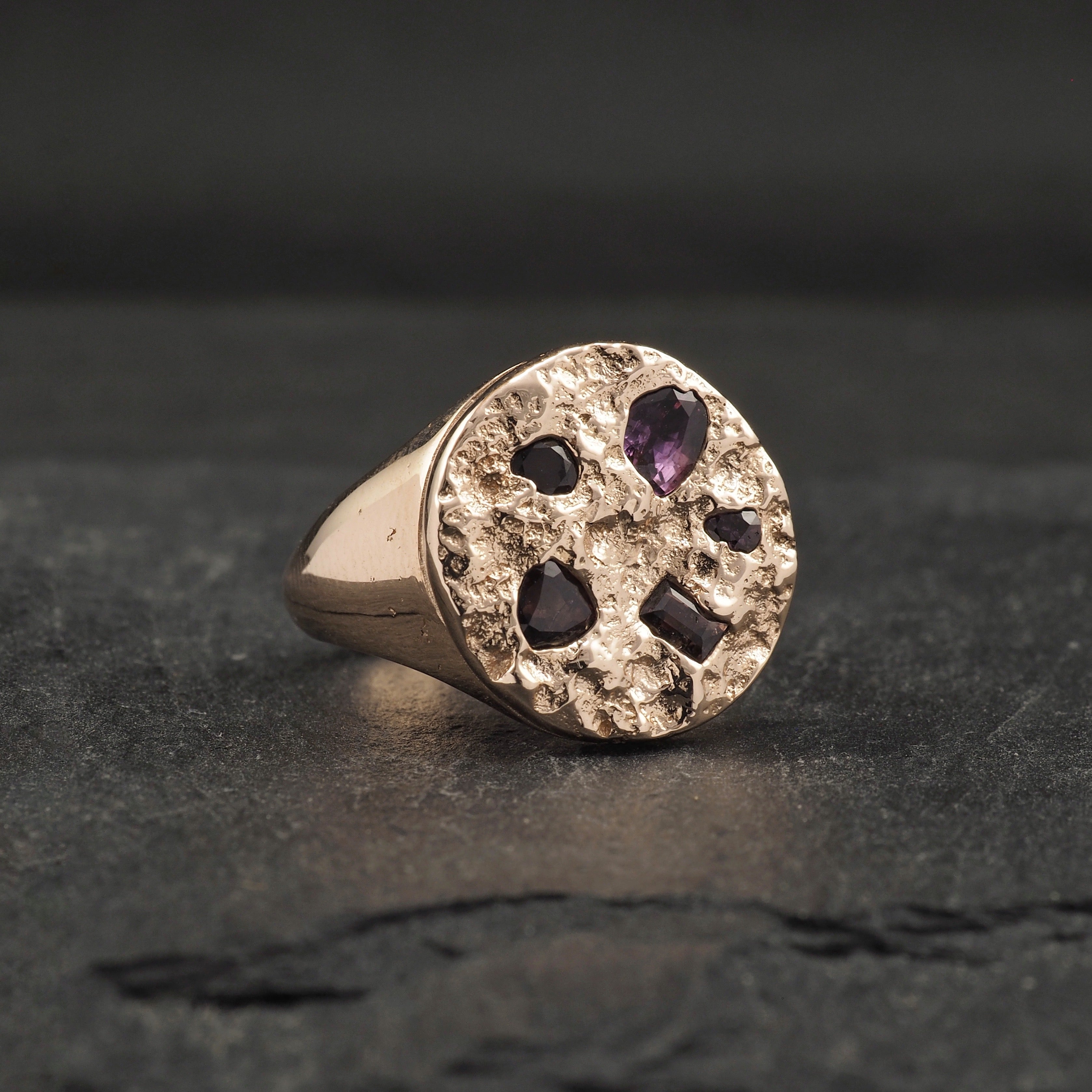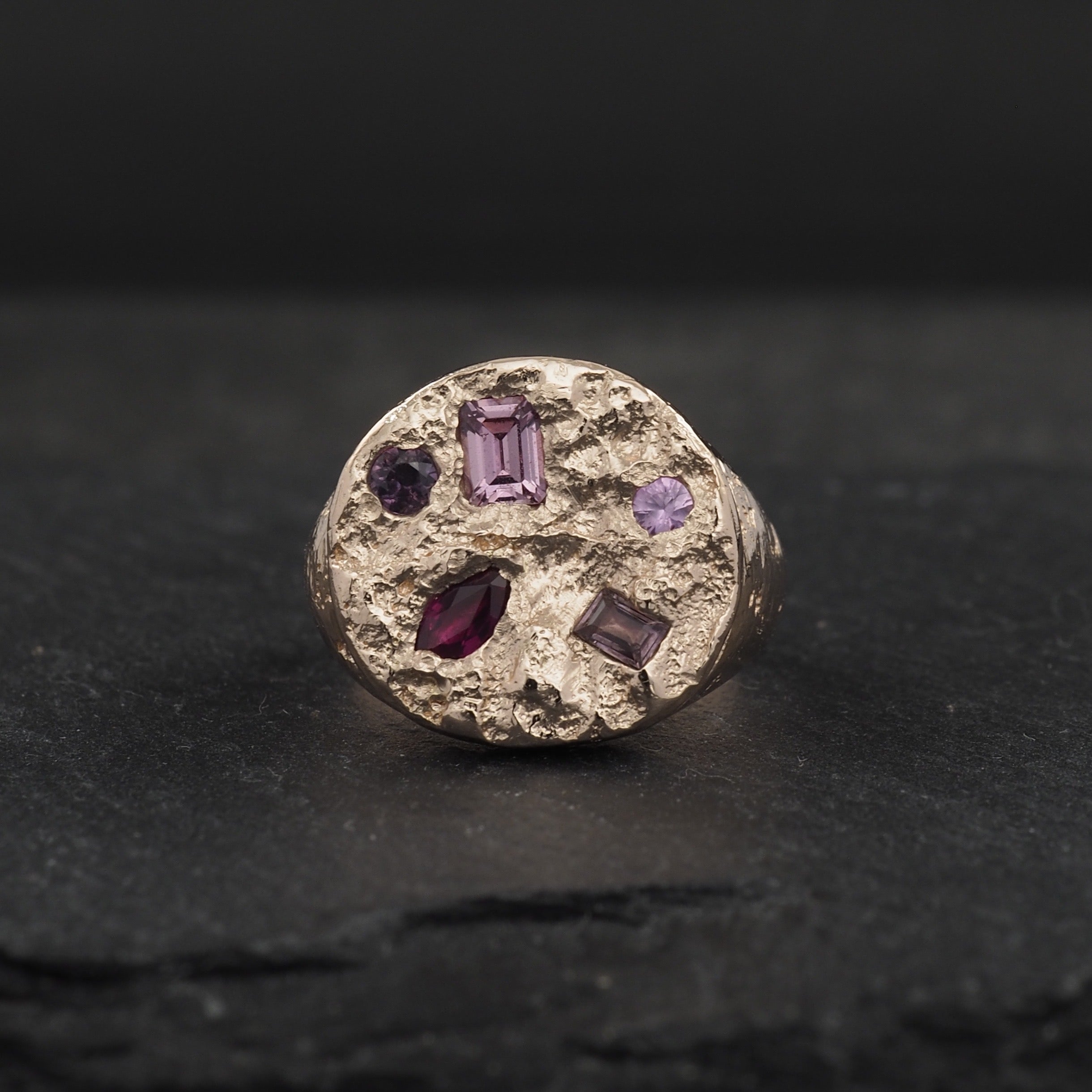 Large round Terra signet in 9k rose gold and a scattering of different pink sapphires