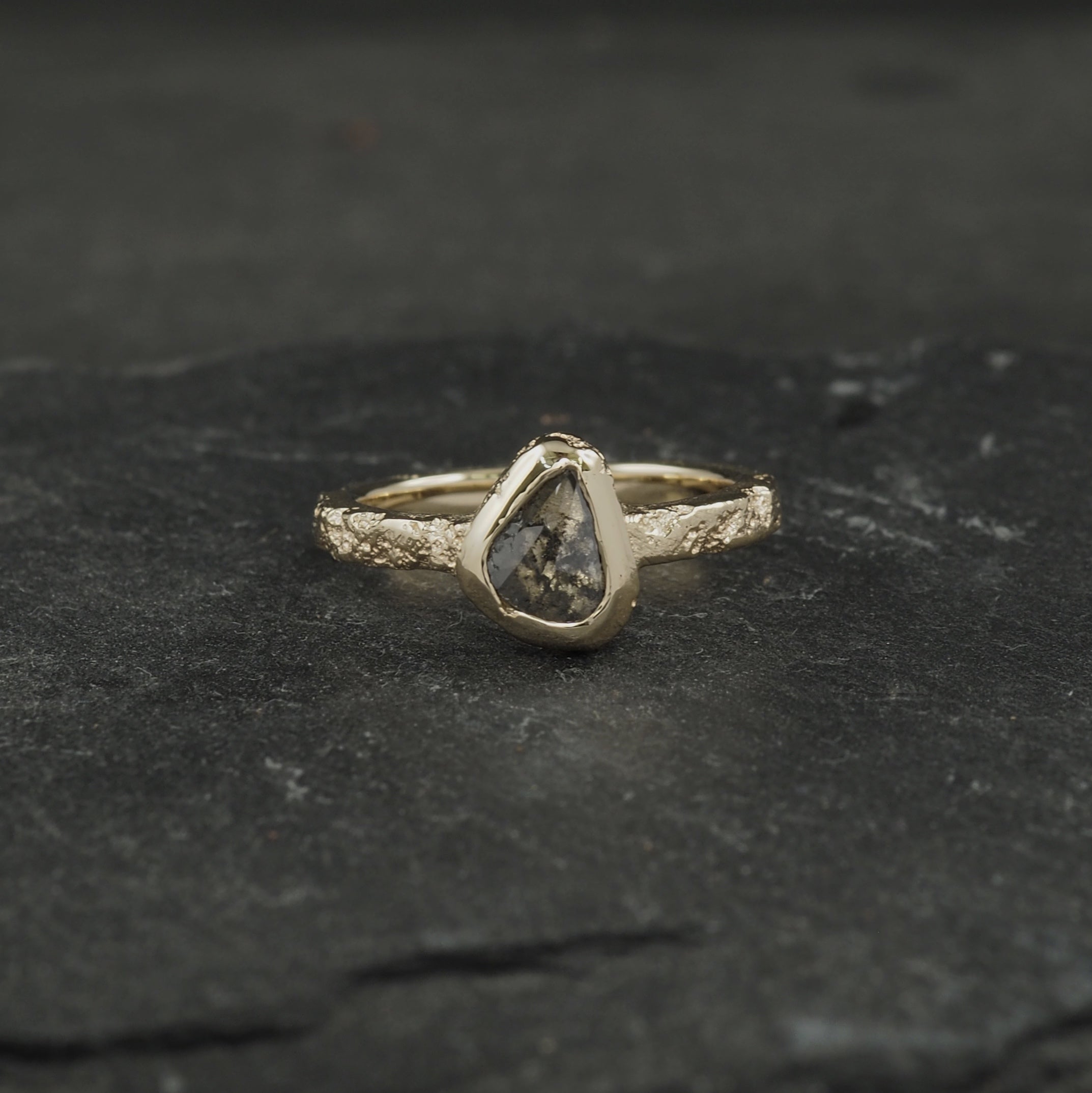 Crater engagement ring in 9k yellow gold with a rose cut salt & pepper diamond