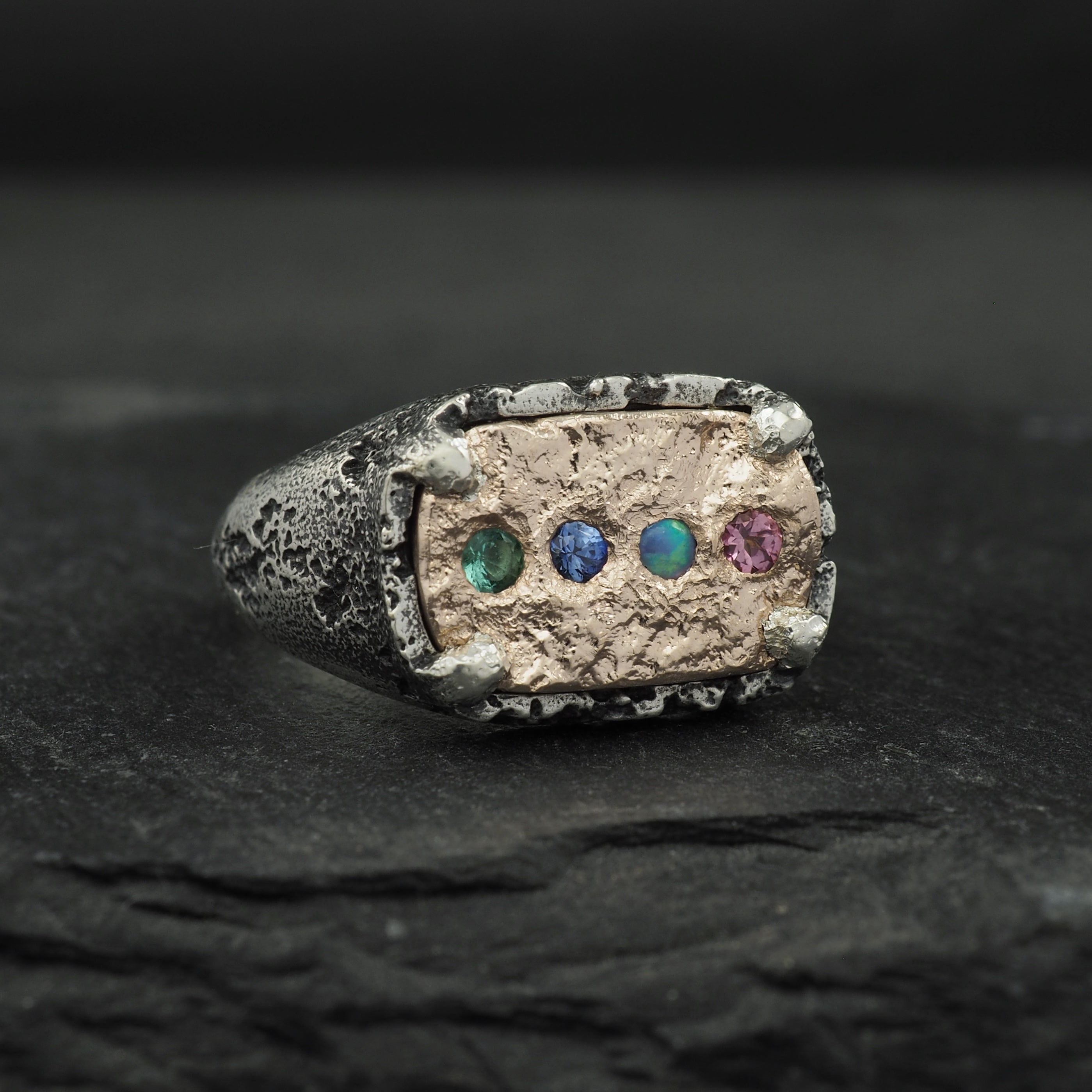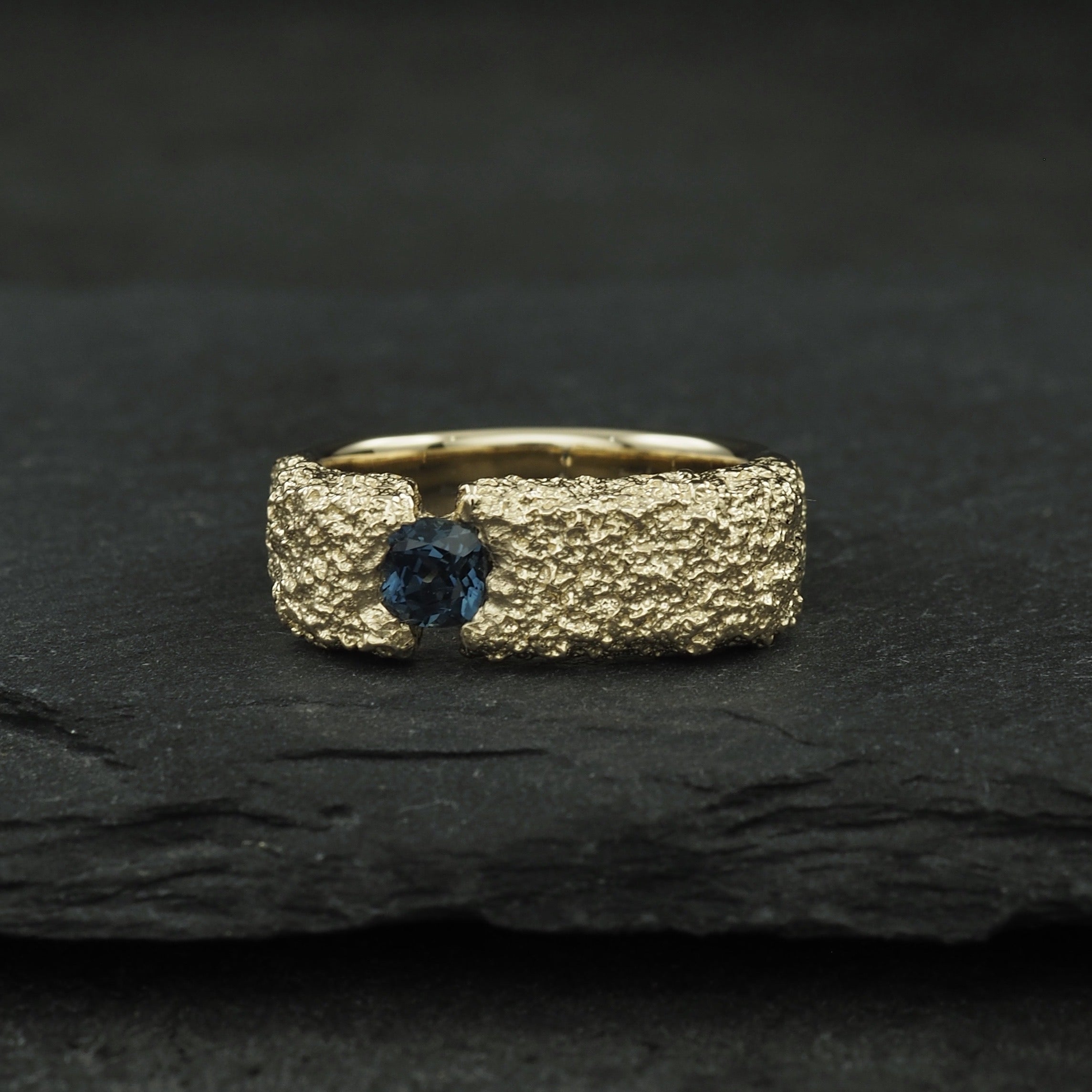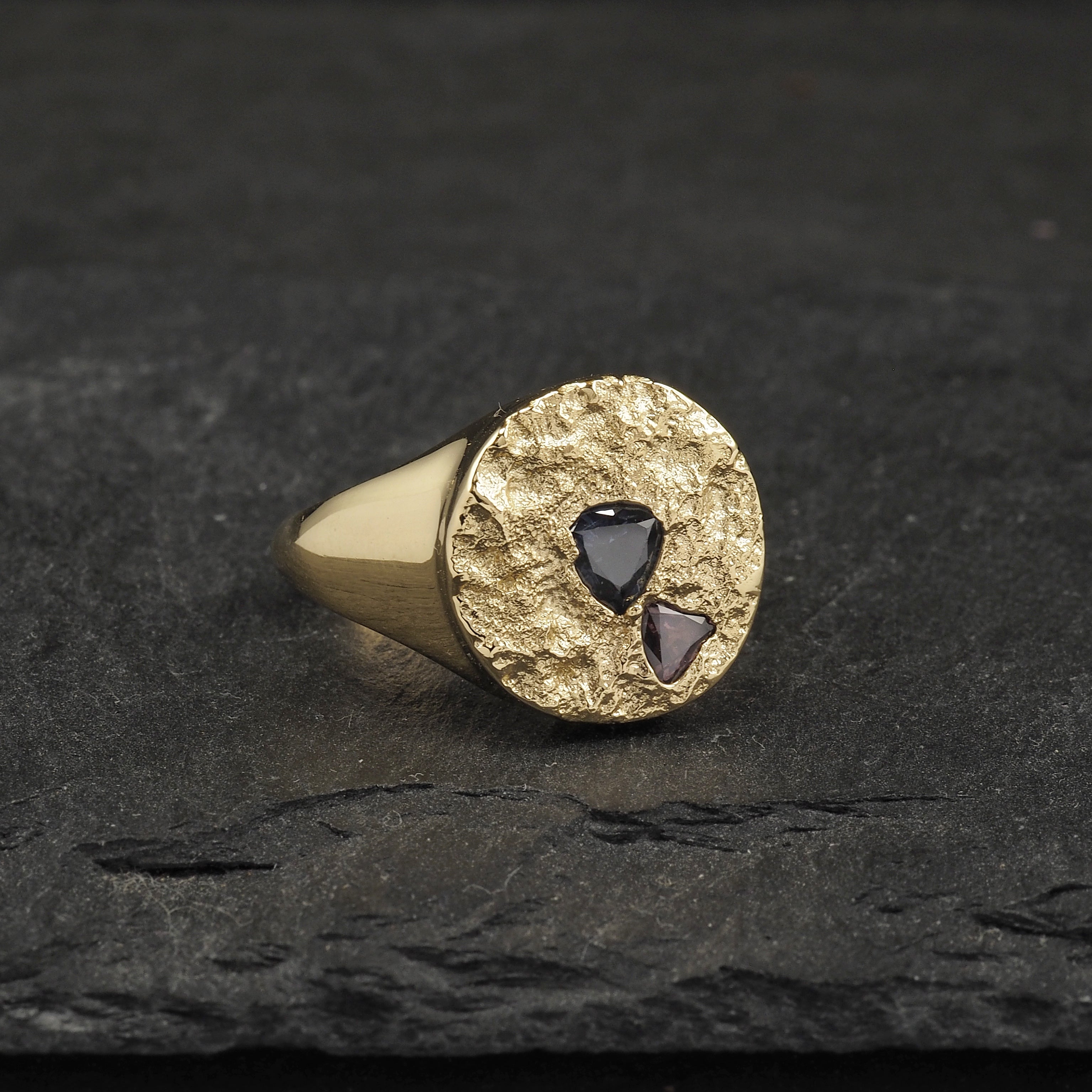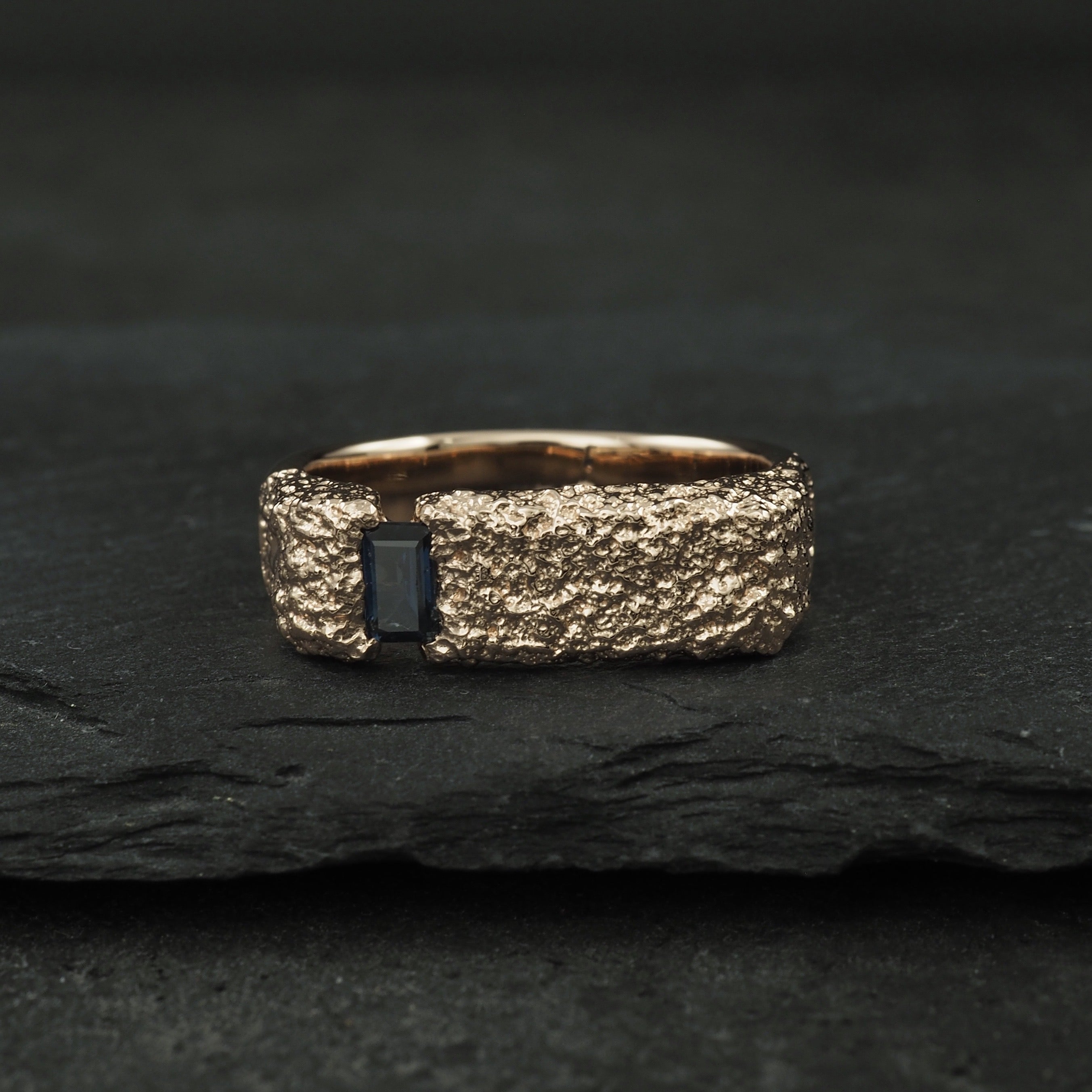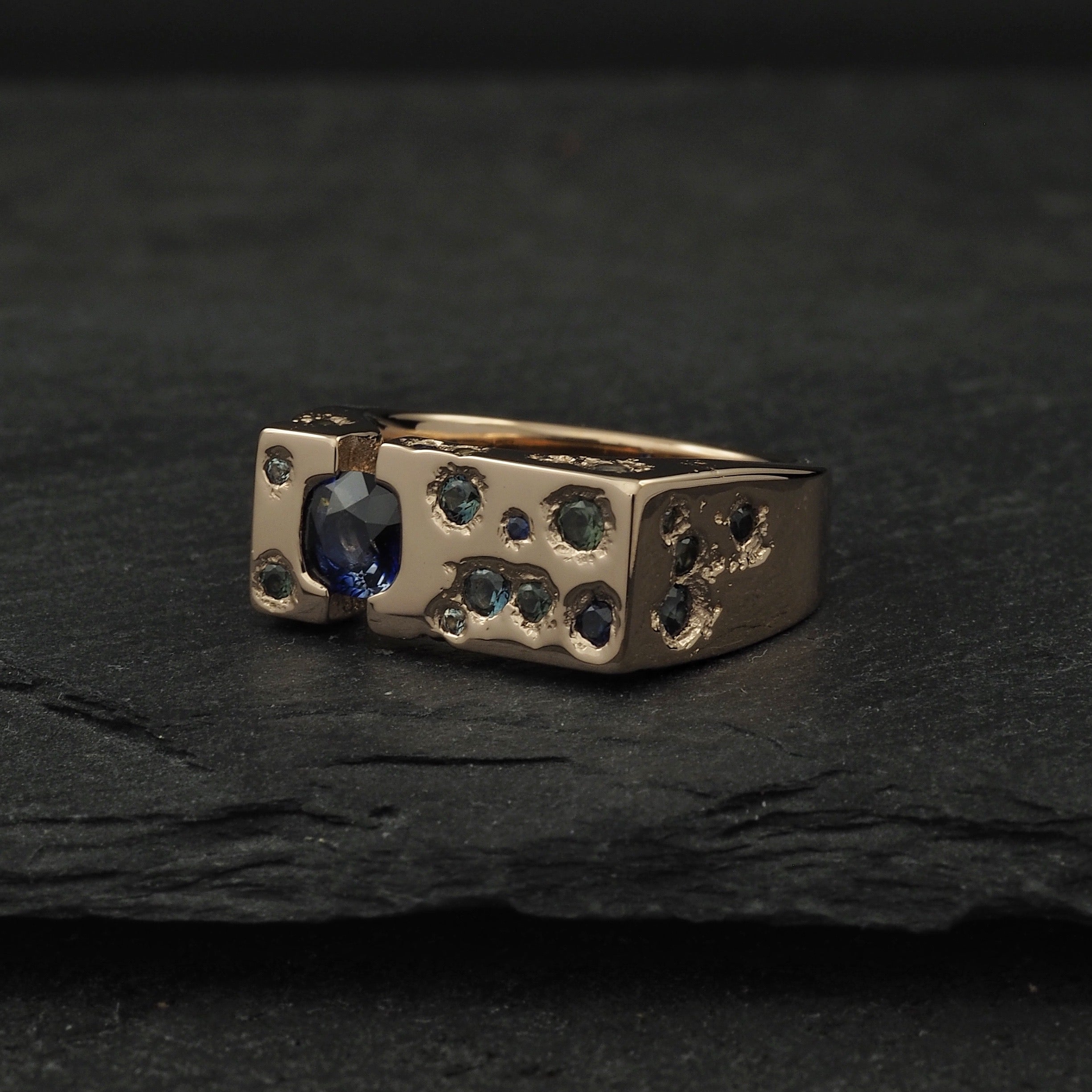 Custom Terra signet wedding ring, with polished sides and cast in place with 4 Australian blue sapphires