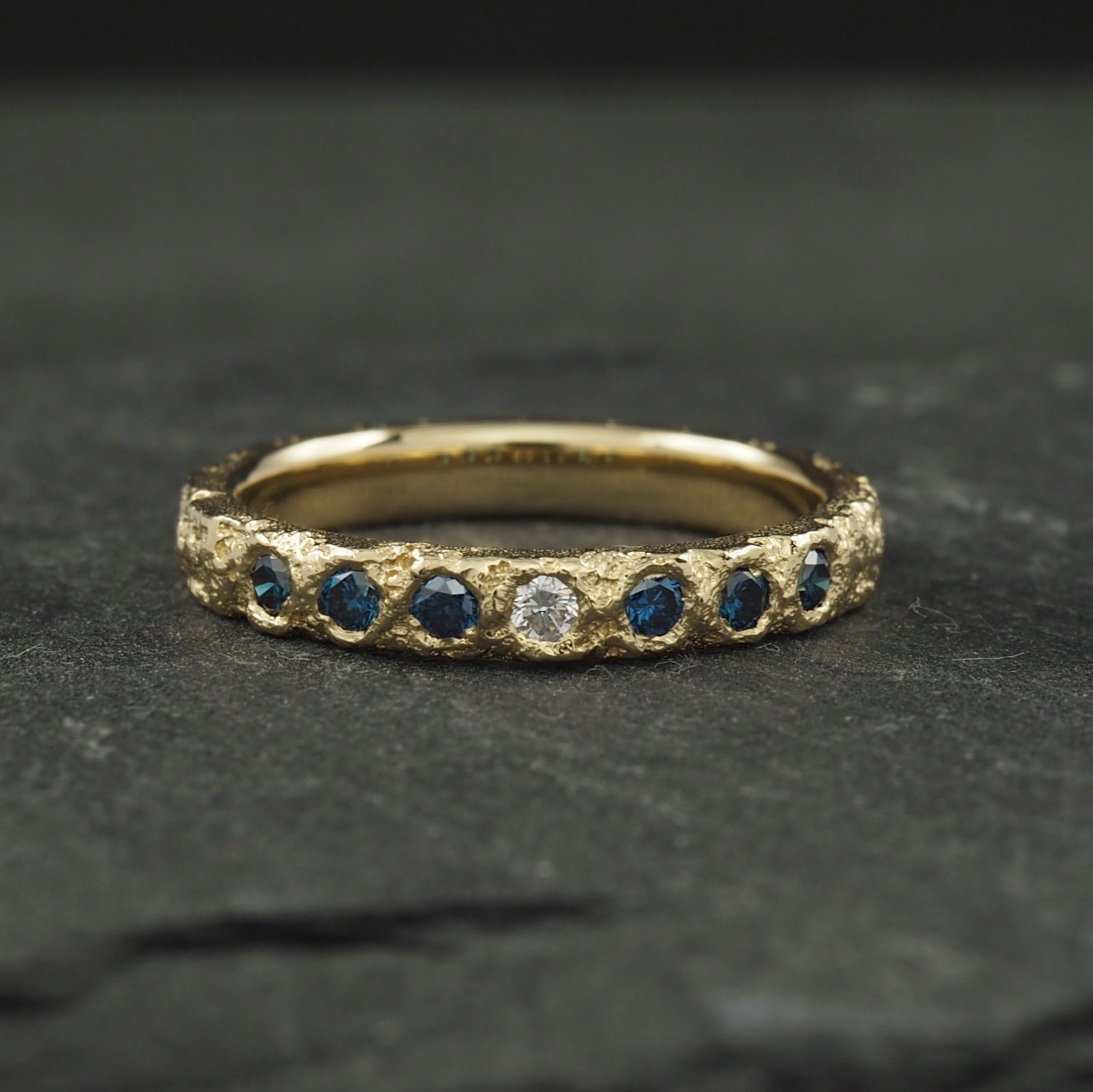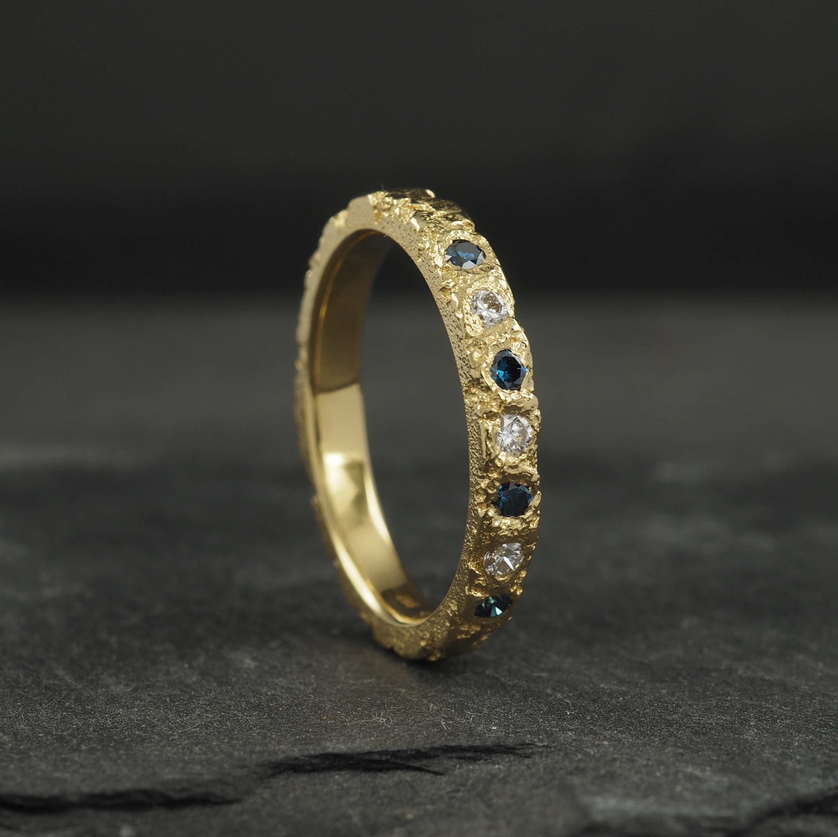 Custom Crater diamond band in 18k yellow gold with blue and white diamonds