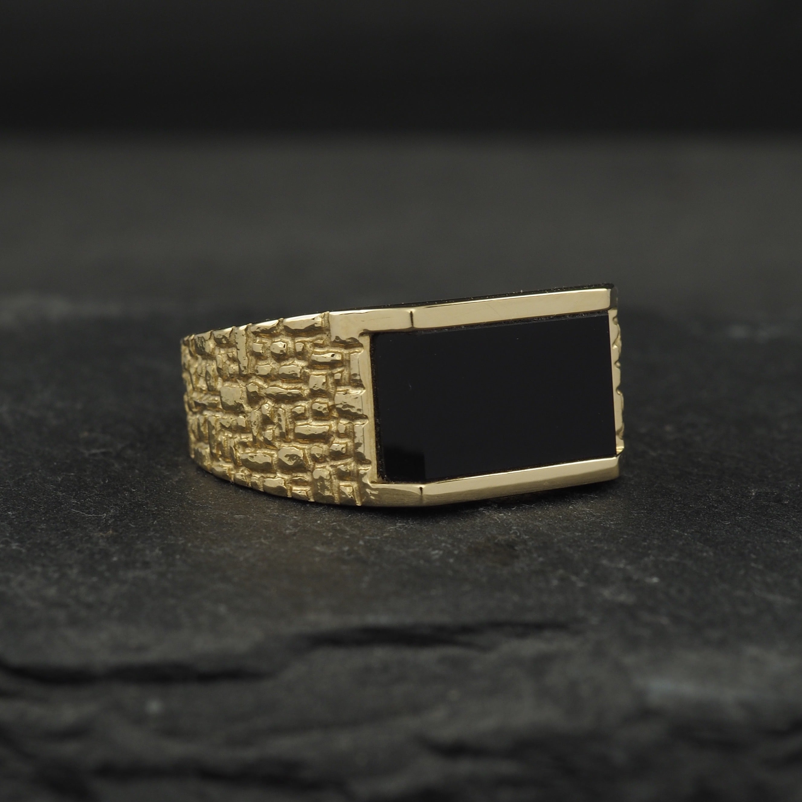 Textured signet wedder in 18k yellow gold and black onyx