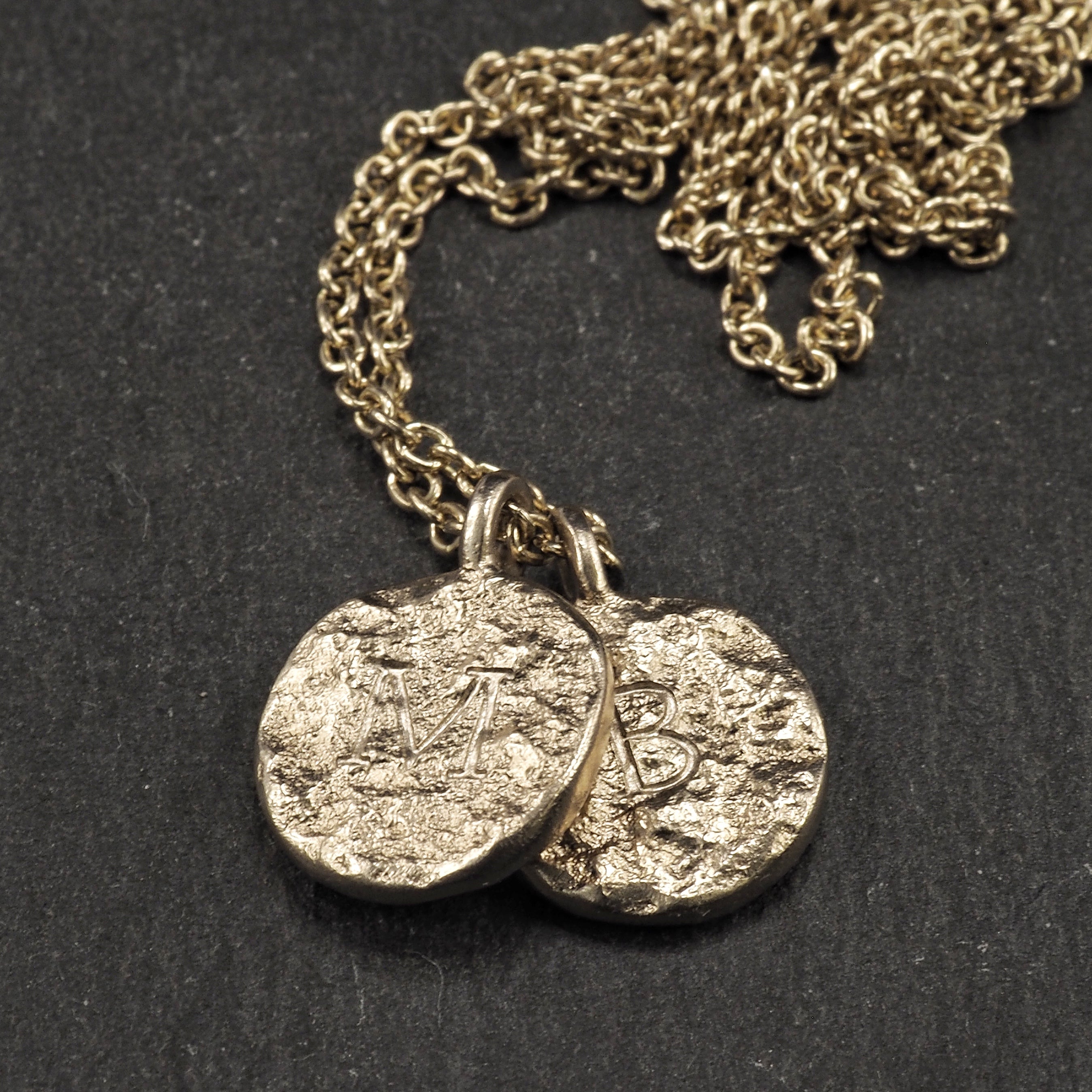 Custom Terra pendants with the families initials in natural 18k white gold