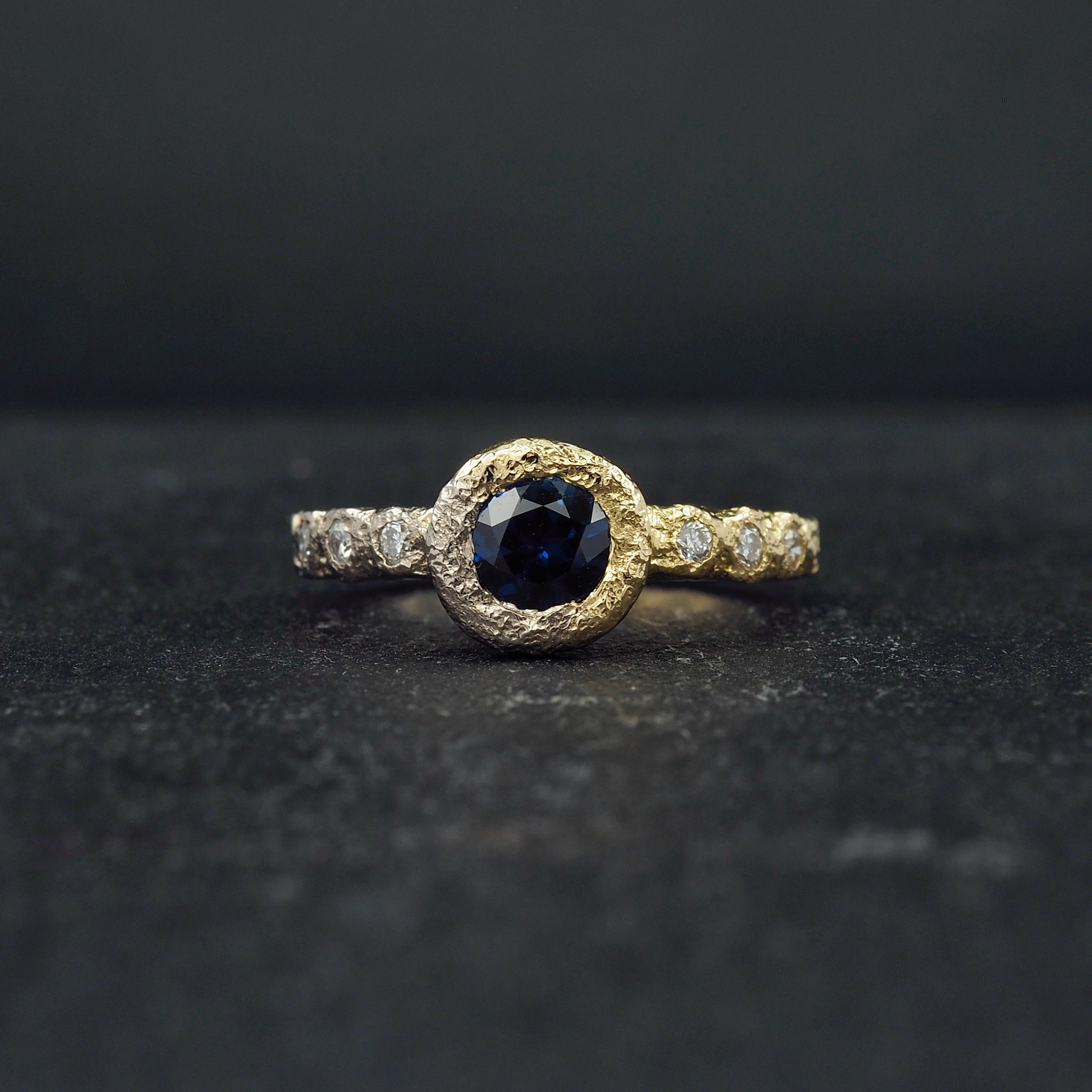 Fusion Crater solitaire ring with a blue sapphire and 6 white diamonds