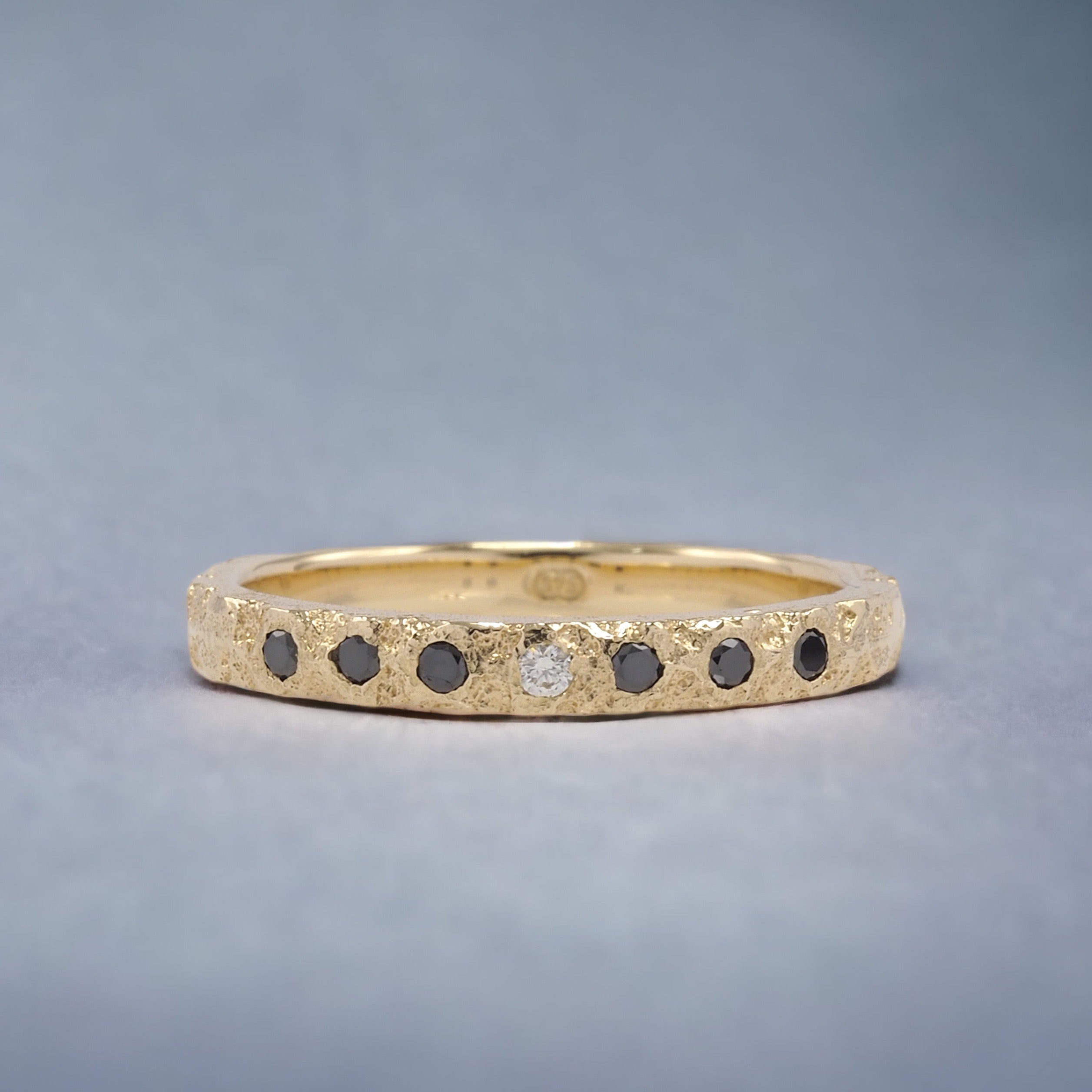 Crater 9k yellow gold with 6 black diamonds and a white diamond in the center